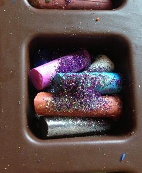 O molde com os lápis de cera deverá ir ao forno para derretê-los, mas antes podemos acrescentar purpurina de diferentes cores ao molde para que a cor resultante seja ainda mais original.