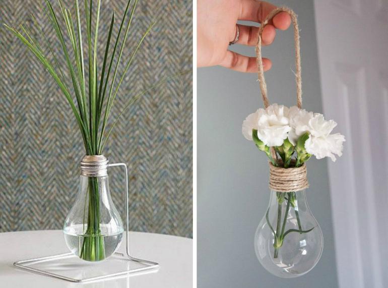 Usar lâmpadas como vasos fica muito original e bonito. Você tem várias possibilidades, pode colocar suspensos, num suporte ou apenas a lâmpada em cima de uma mesa. É perfeito para pequenas plantas ou flores.