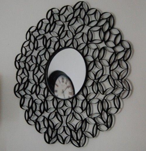 Molduras. Já imaginou que vários rolos de papel podem se converter em uma bonita moldura para espelho, como a da imagem ao lado? E é muito simples: corte os rolos de papel na horizontal de forma a obter várias argolas ovaladas, cole as argolas juntas formando círculos, una os círculos deixando um espaço para colocar o espelho no centro, pinte da cor que desejar e encaixe o espelho na moldura.