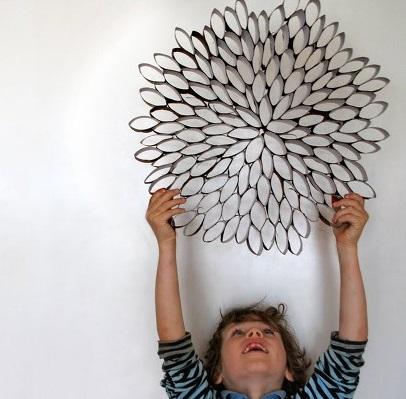 Escultura de parede. De forma semelhante à dica anterior você pode converter vários rolos de papel em uma interessante escultura para decorar uma parede. Para isso basta cortar os rolos de papel na horizontal de forma a obter várias argolas ovaladas, colá-las umas às outras e pintar! Se quiser variar um pouco na forma jogue com as argolas, formando flores e colocando-as em posições diferentes.