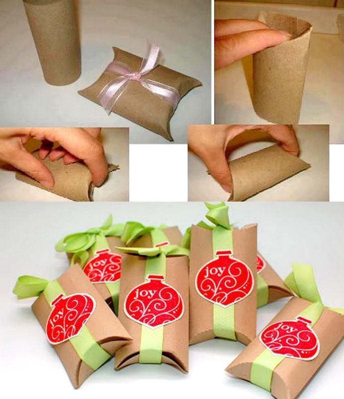 Caixa presente. Você precisa de uma caixa presente de imediato sem gastar dinheiro? Um simples rolo de papel pode ser sua salvação! Para isso faça como no tutorial ao lado: achate o rolo, dobre uma das extremidades para dentro (poderá ser necessário usar cola para as manter juntas), insira o conteúdo, dobra a outra extremidade para dentro, sele a embalagem com uma fita bonita amarrada em laço e cole um adesivo temático.