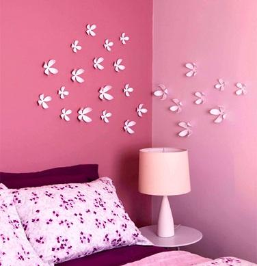 Flores. E que tal umas florzinhas feitas de rolo de papel para decorar as paredes de um quarto de menina? Este artesanato é tão simples que você ficará se questionando como não pensou nisso antes! Recorte o rolo de papel de forma a abri-lo e desenhe nele uma forma simples de flor, com quatro ou cinco pétalas, recorte a flor, pinte e fixe-a à parece com uma gota de cola quente.