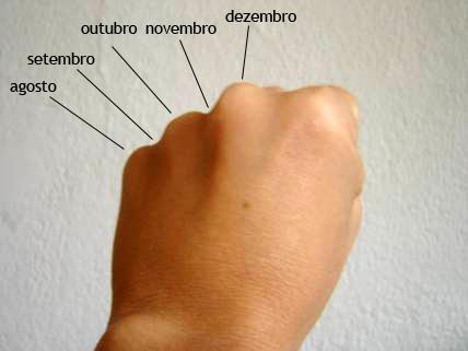 Nomeie cada mês, a partir de janeiro, enquanto se move ao longo dos nós e espaços entre eles. Note que existem quatro saliências dos ossos em cada mão e quatro espaços entre um dedo e outro. Por exemplo, diga janeiro, sobre a primeira articulação da sua mão esquerda (isto corresponde à saliência do osso do seu dedo mindinho). A seguir, diga fevereiro no espaço seguinte e na próxima saliência será março (este corresponde à saliência do seu dedo anelar da mão esquerda). Cada saliência de osso representa um mês de 31 dias. Cada espaço entre os dedos representa um mês com 30 dias ou 28 dias no caso do mês de fevereiro.