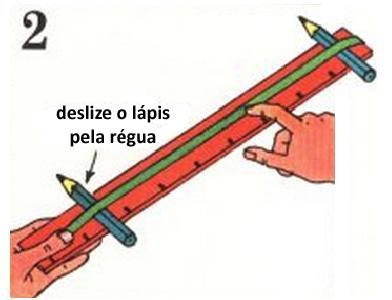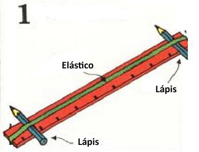 Coloque um elástico ao redor de uma régua, como na imagem, e em cada extremo da régua e embaixo do elástico ponha os lápis.