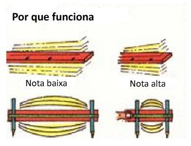 Por que funciona. Quando uma régua ou um elástico são longos, vibram devagar e dão notas baixas. Quando são curtos, vibram mais rápido e dão notas altas. Os sons altos e baixos dependem da rapidez com que vibram as coisas.