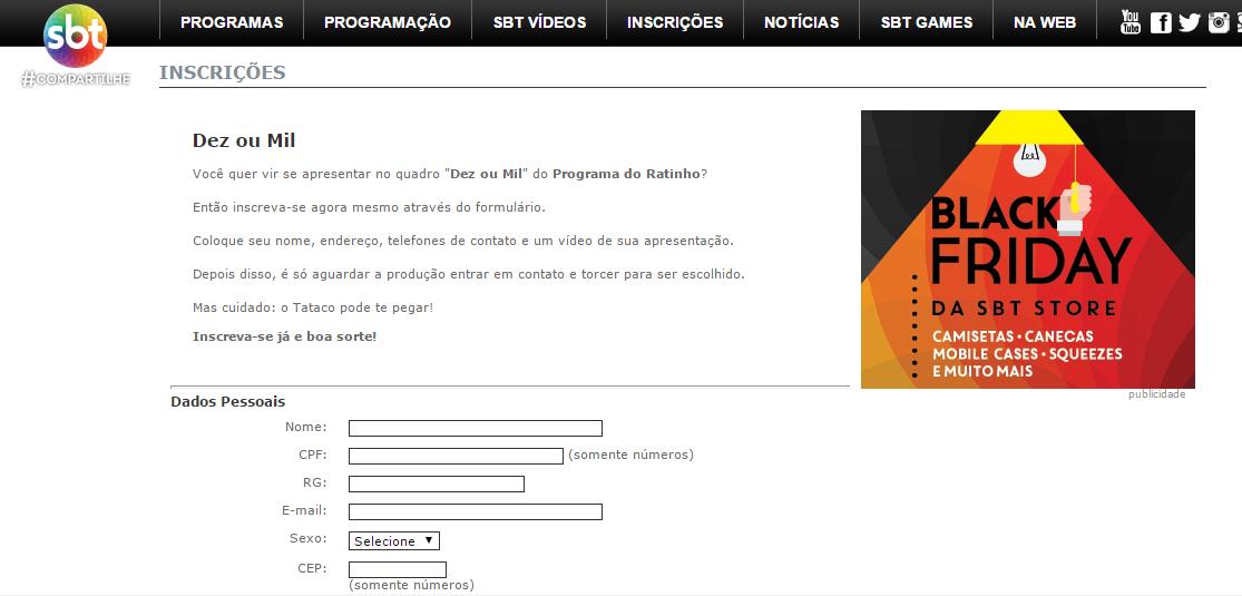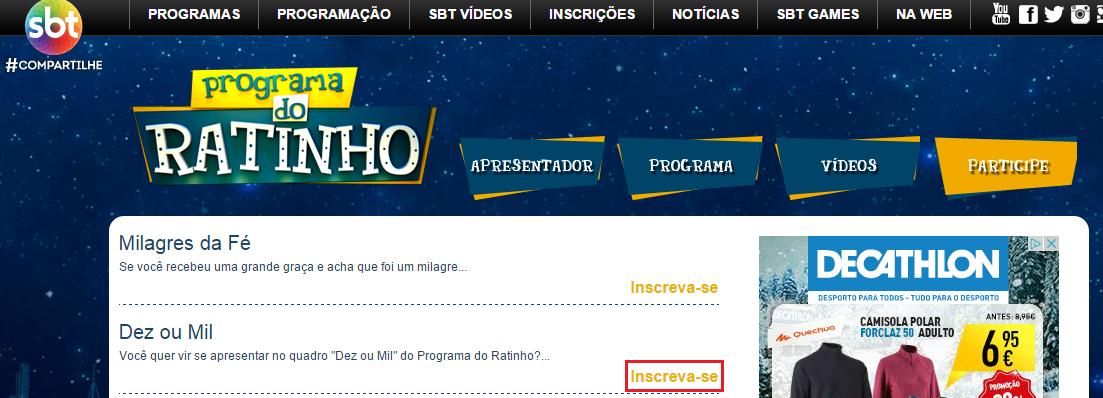 Para se inscrever no Dez ou Mil, você deve acessar o site oficial da SBT. De seguida, vá a Programas - Linhas de Shows - Programa do Ratinho. Clique no botão "Participe", procure pelo quadro e clique em "Inscreva-se". Ou, se preferir, pode clicar aqui e ir diretamente para a página de inscrição.