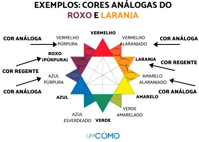 Para conhecer mais exemplos de cores análogas, aqui no umCOMO te apresentamos a seguinte lista. A primeira cor indicada funciona como dominante, enquanto as que a acompanham são suas cores análogas. Ou seja, se dissermos que o amarelo-esverdeado e o laranja-amarelado são exemplos de cores análogas do amarelo, o amarelo funciona como a cor dominante, e as outras duas são suas cores análogas.